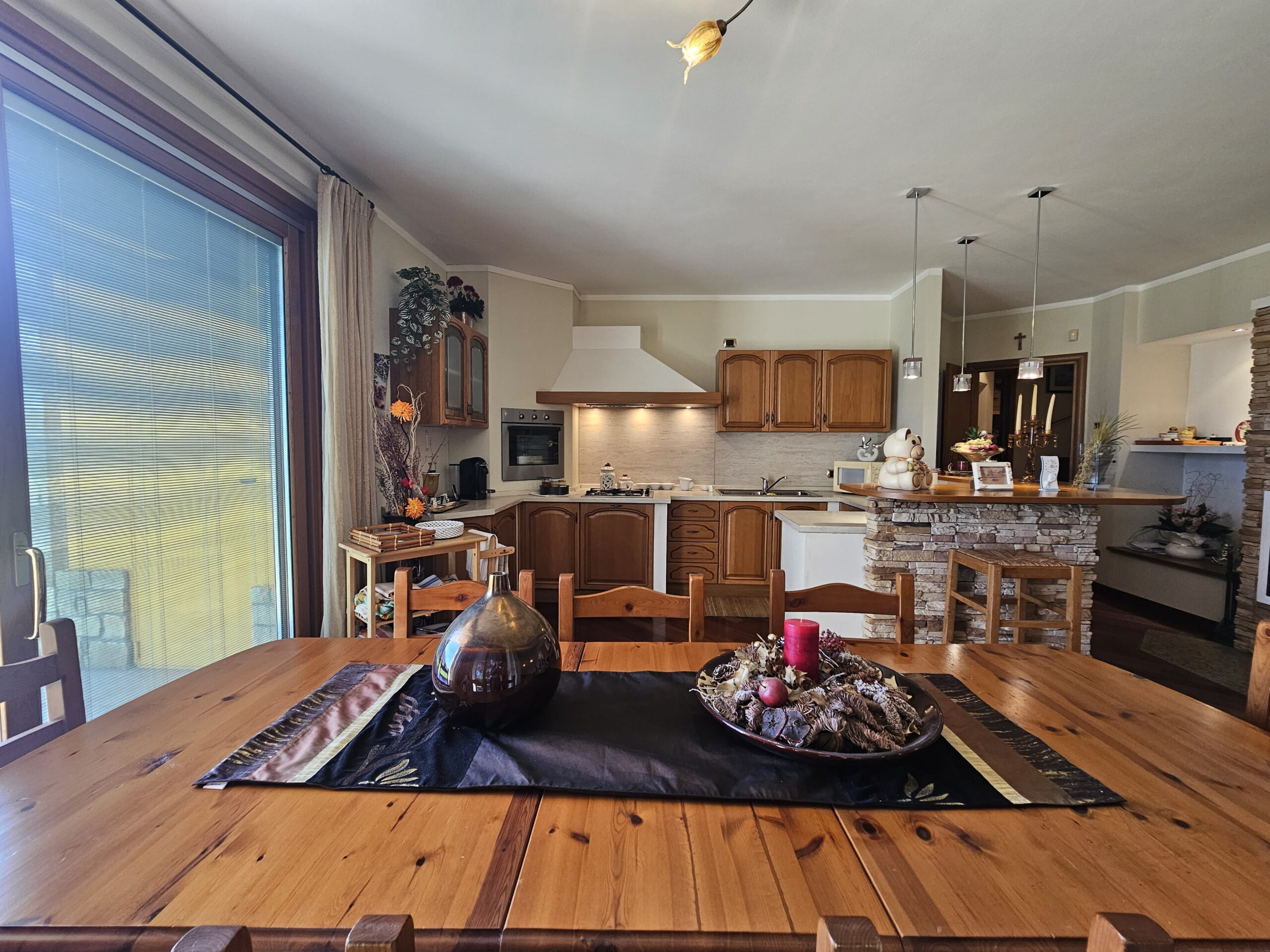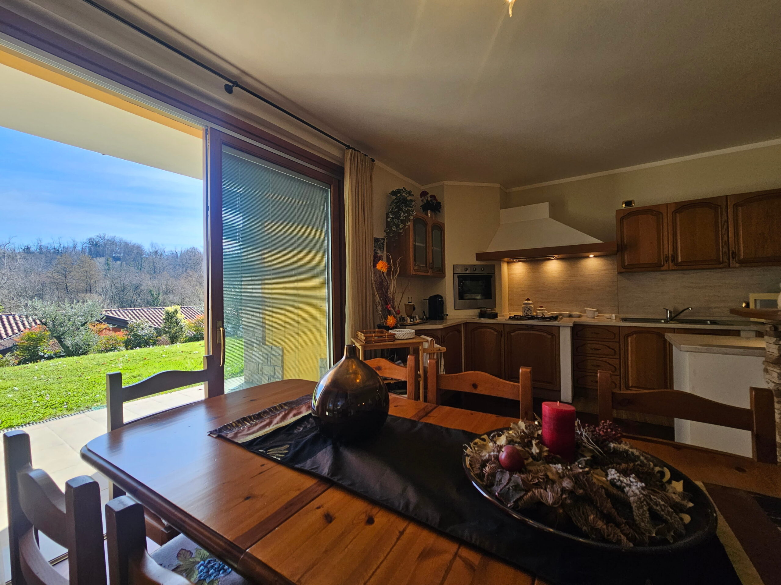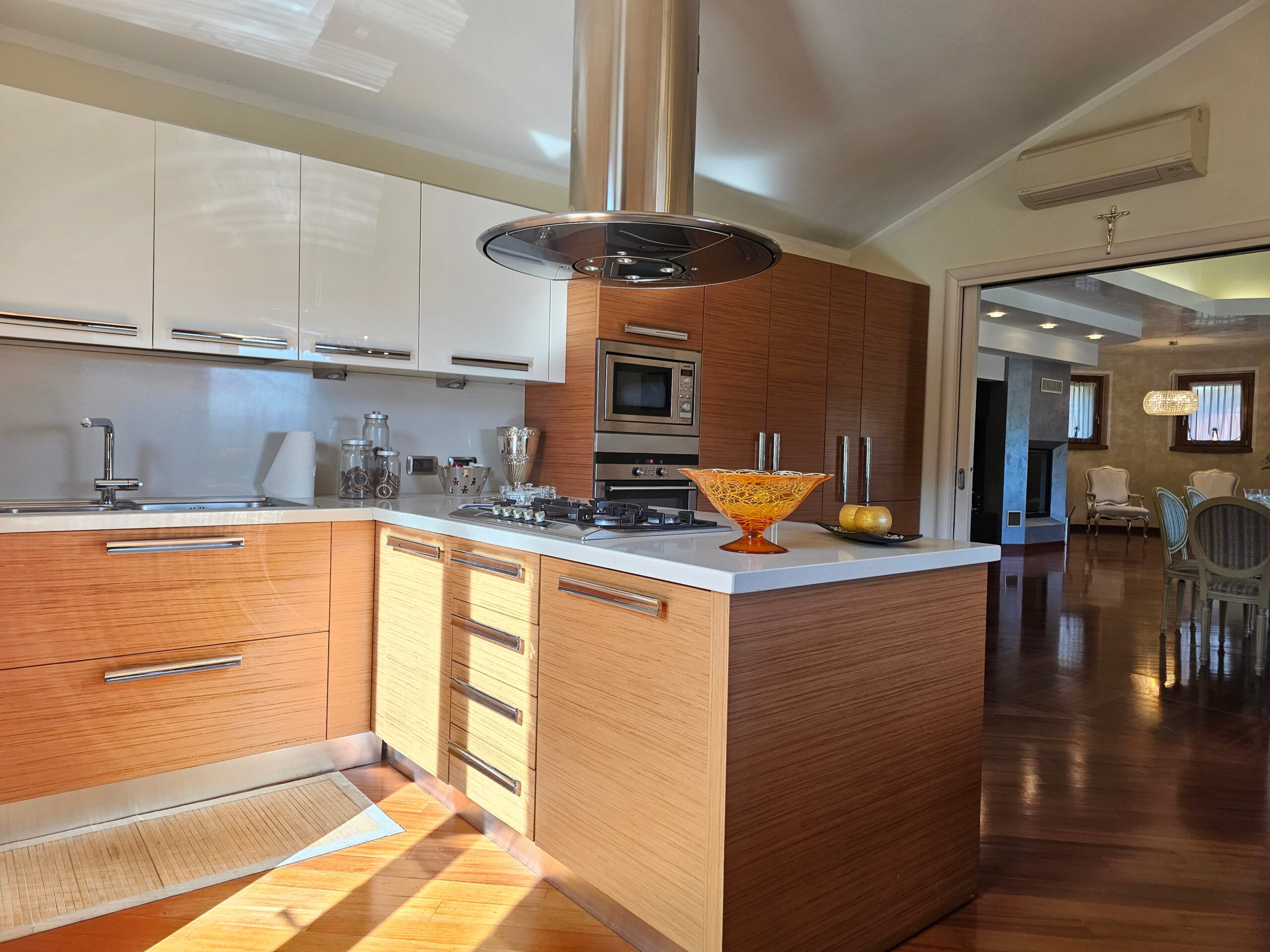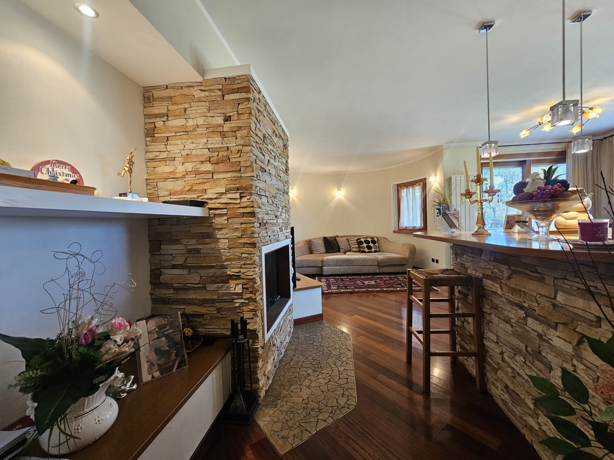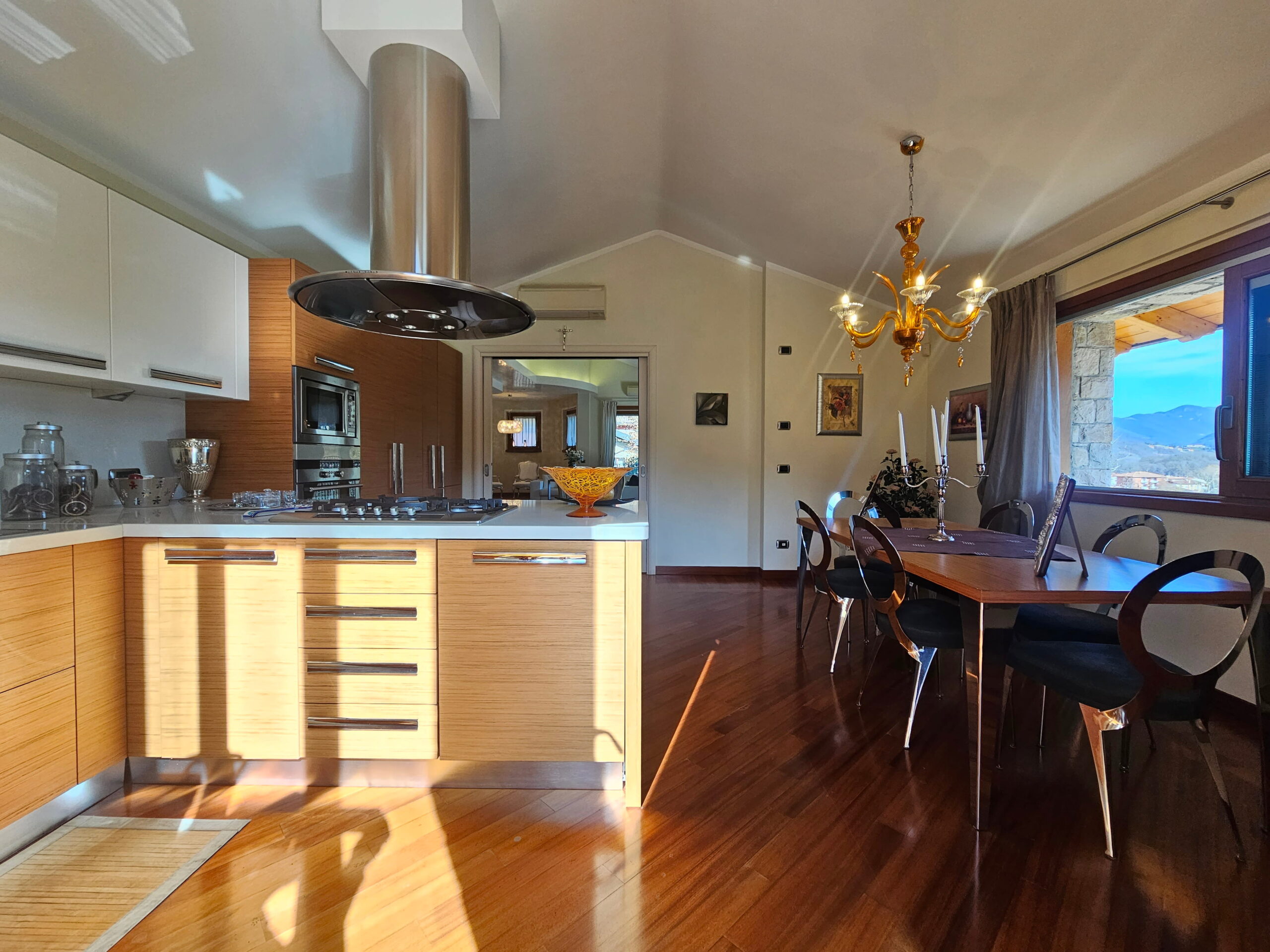 Piano Rialzato – Zona giorno panoramica: -Ingresso con guardaroba su misura e bagno ospiti -Luminoso soggiorno con camino, affacciato su terrazzo panoramico -Sala da pranzo -Cucina abitabile con accesso diretto al terrazzo -Camera versatile, ideale come studio o matrimoniale