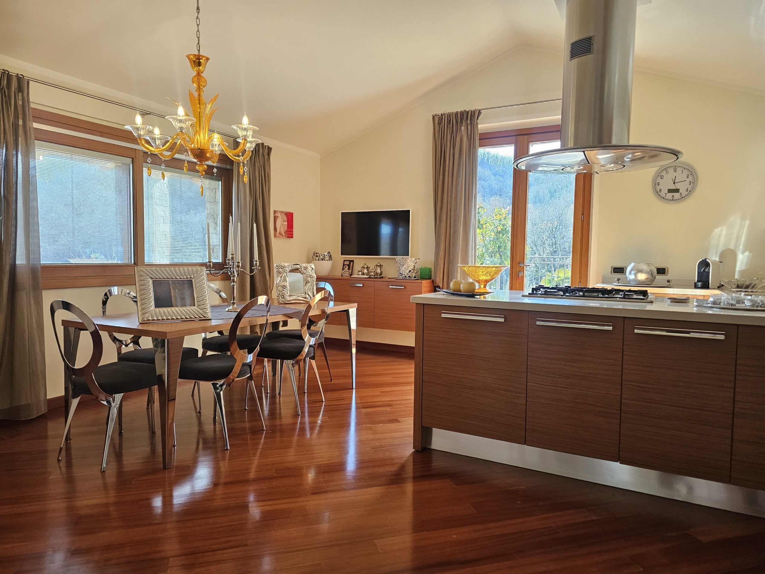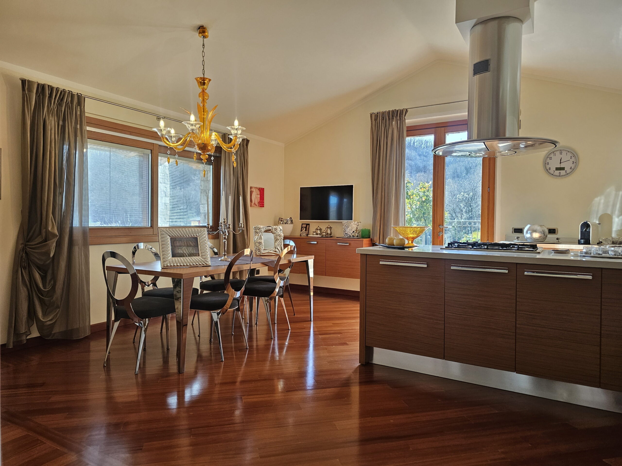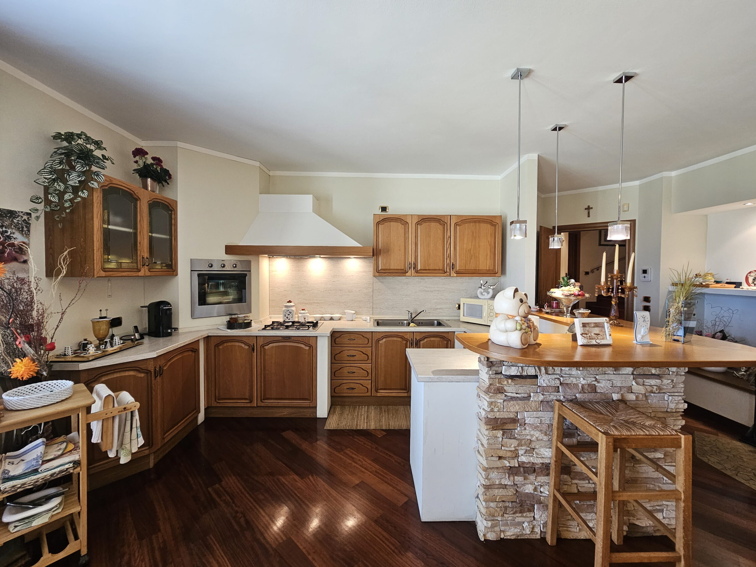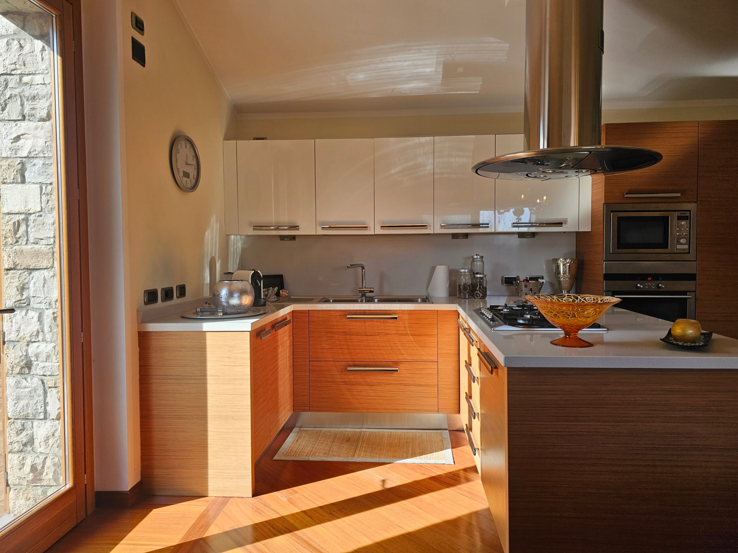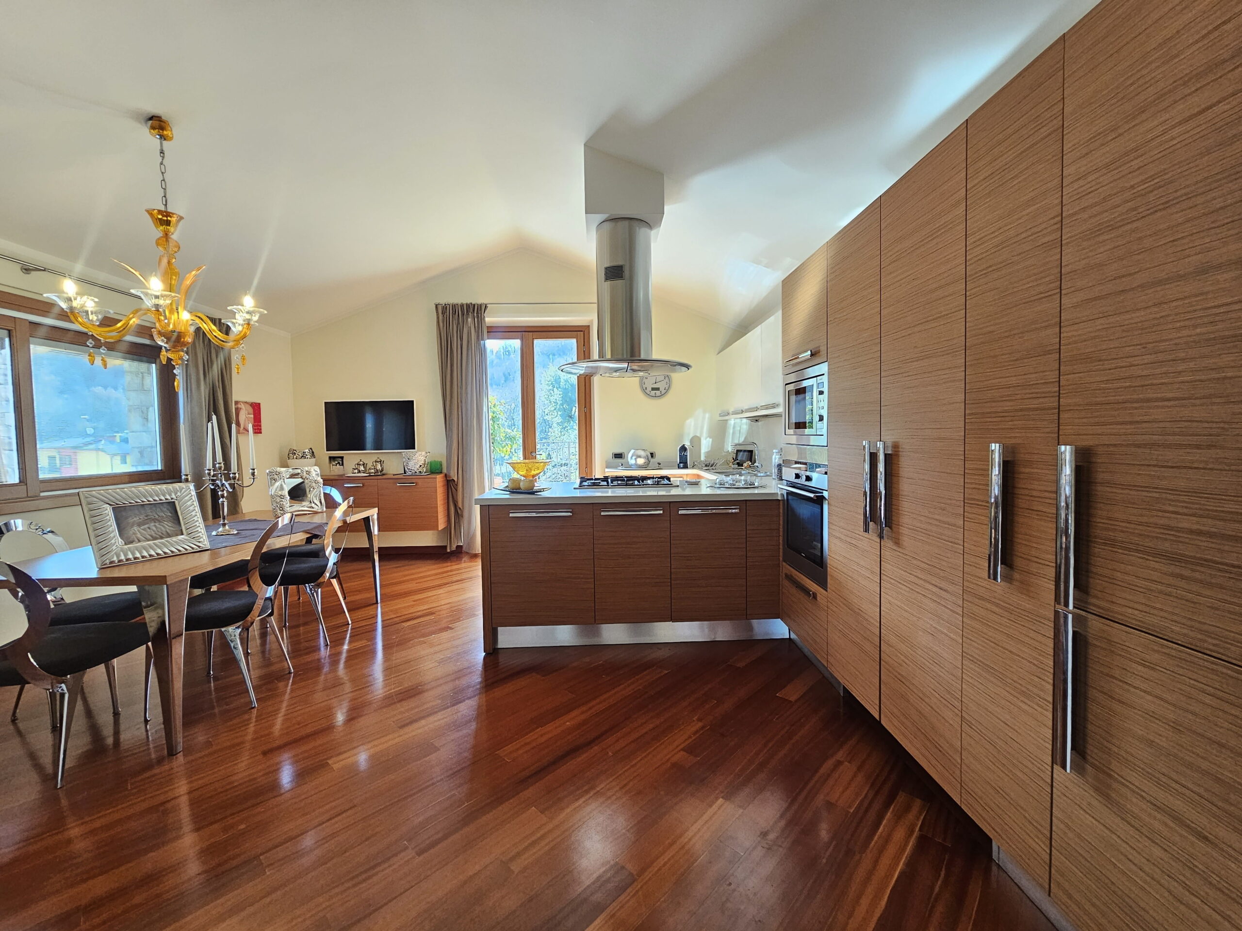 Piano Rialzato – Zona giorno panoramica: -Ingresso con guardaroba su misura e bagno ospiti -Luminoso soggiorno con camino, affacciato su terrazzo panoramico -Sala da pranzo -Cucina abitabile con accesso diretto al terrazzo -Camera versatile, ideale come studio o matrimoniale