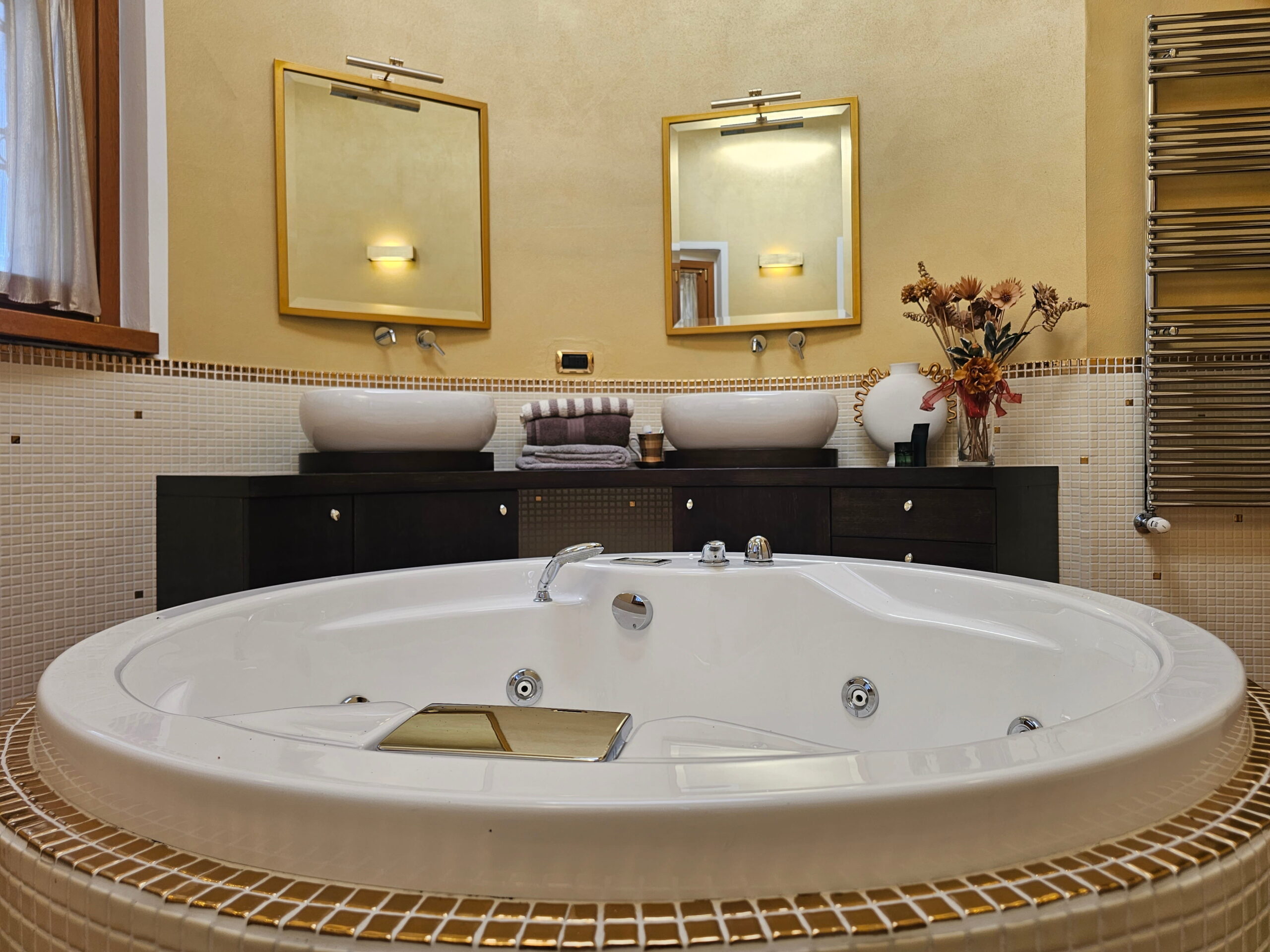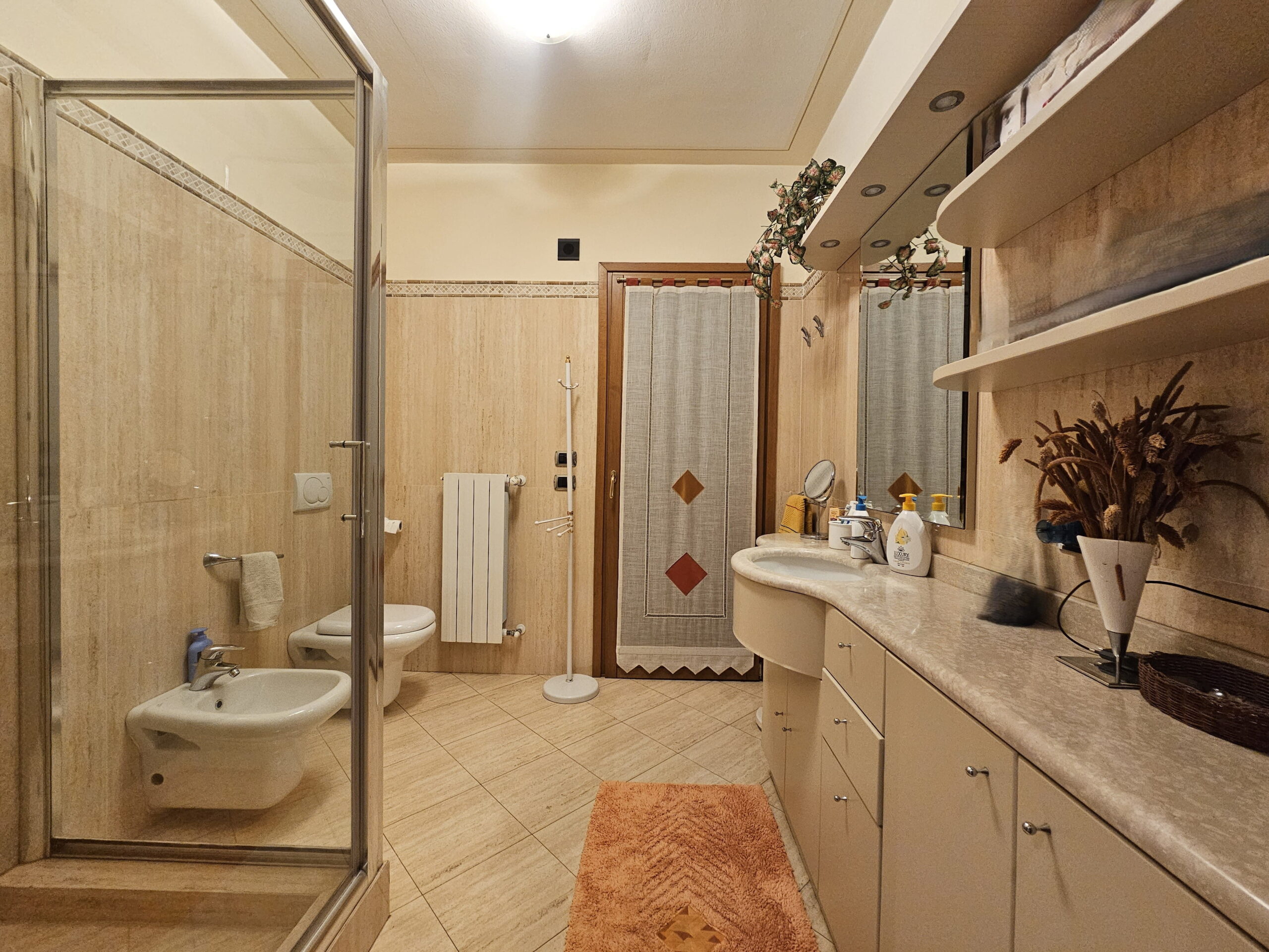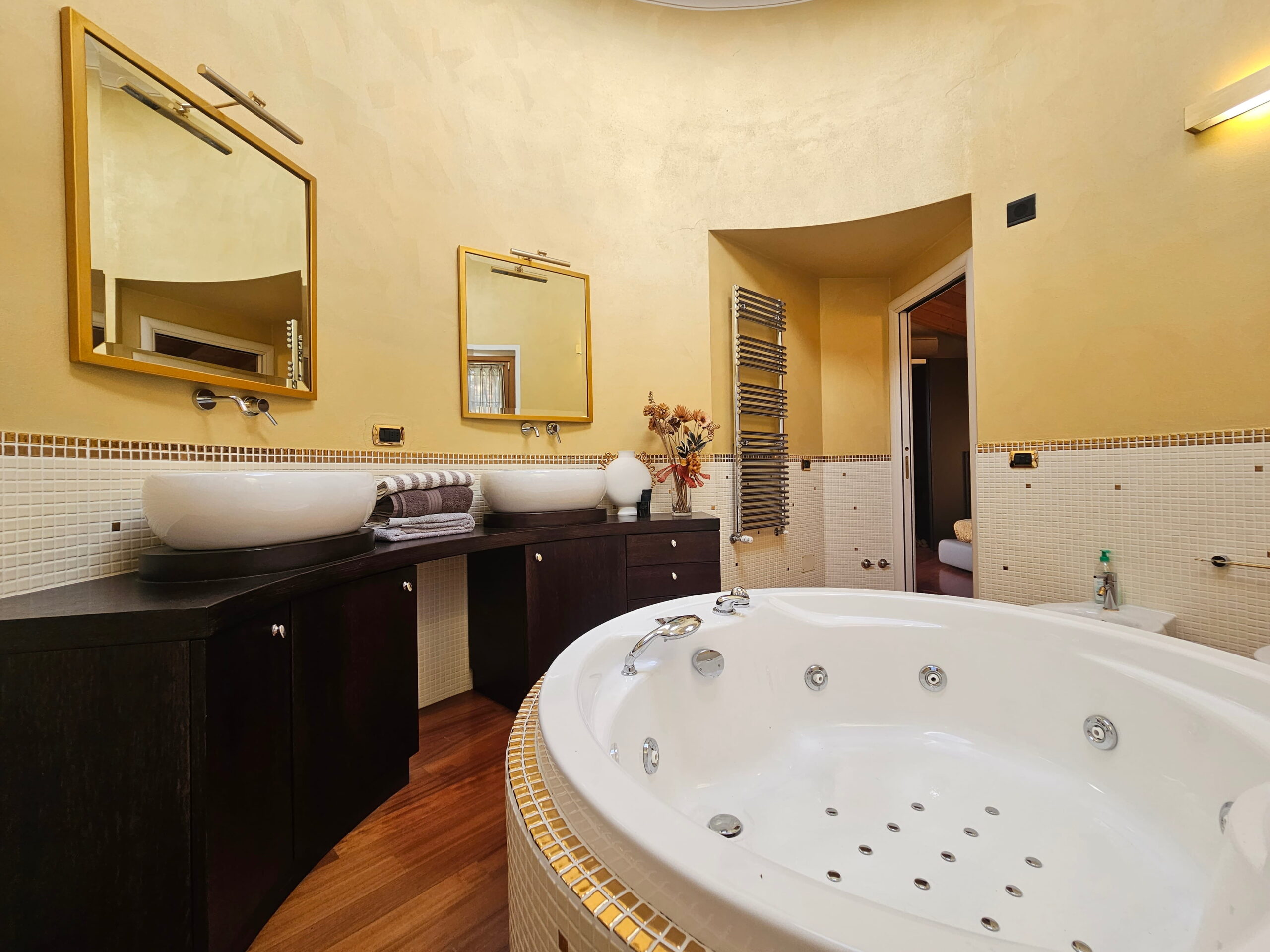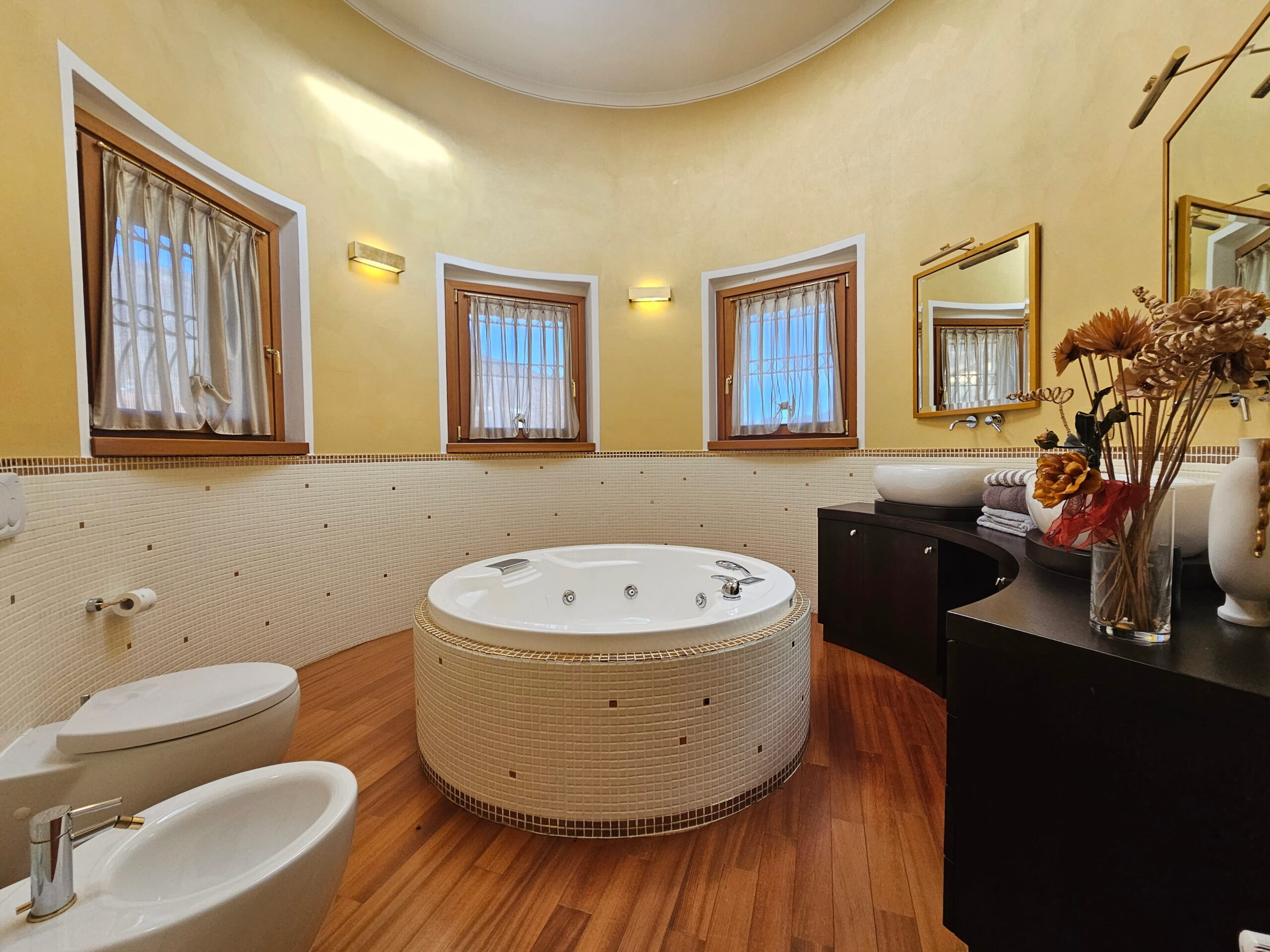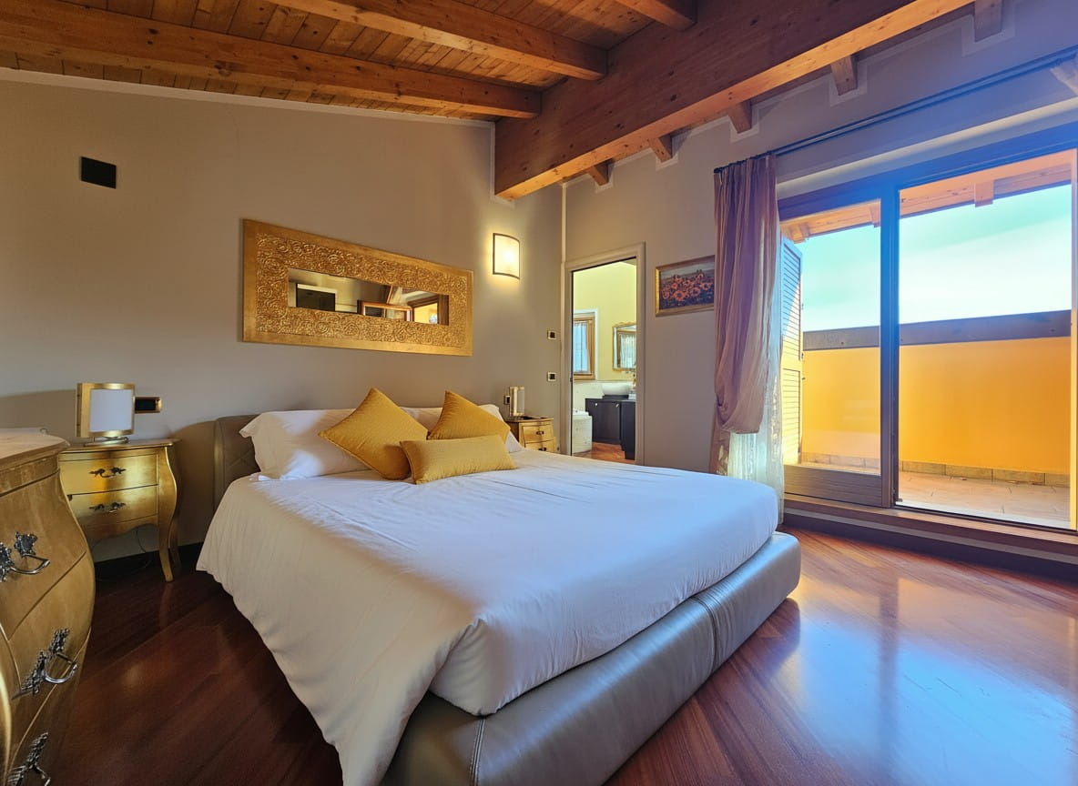 Piano Primo – Zona notte: -Suite padronale con balcone panoramico e bagno privato con vasca Jacuzzi centrale e doppio lavabo -Seconda camera matrimoniale con balcone e bagno finestrato con doppia doccia. Finiture e dotazioni di alto livello.