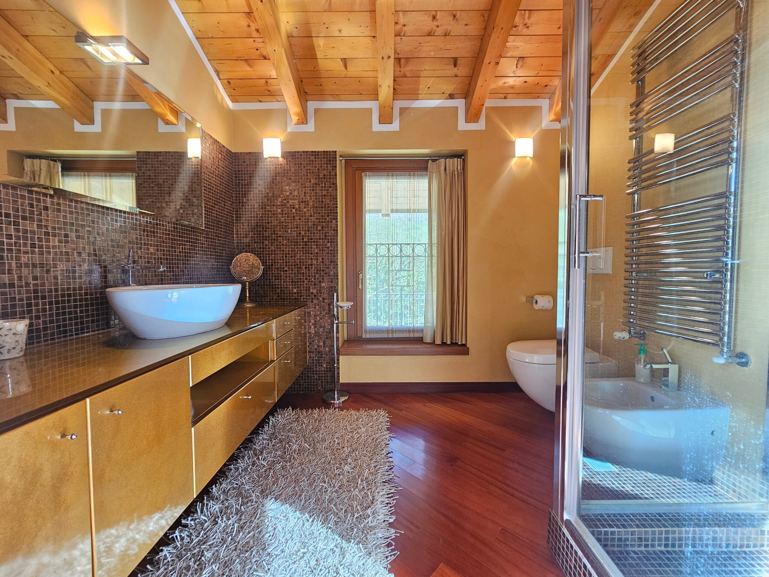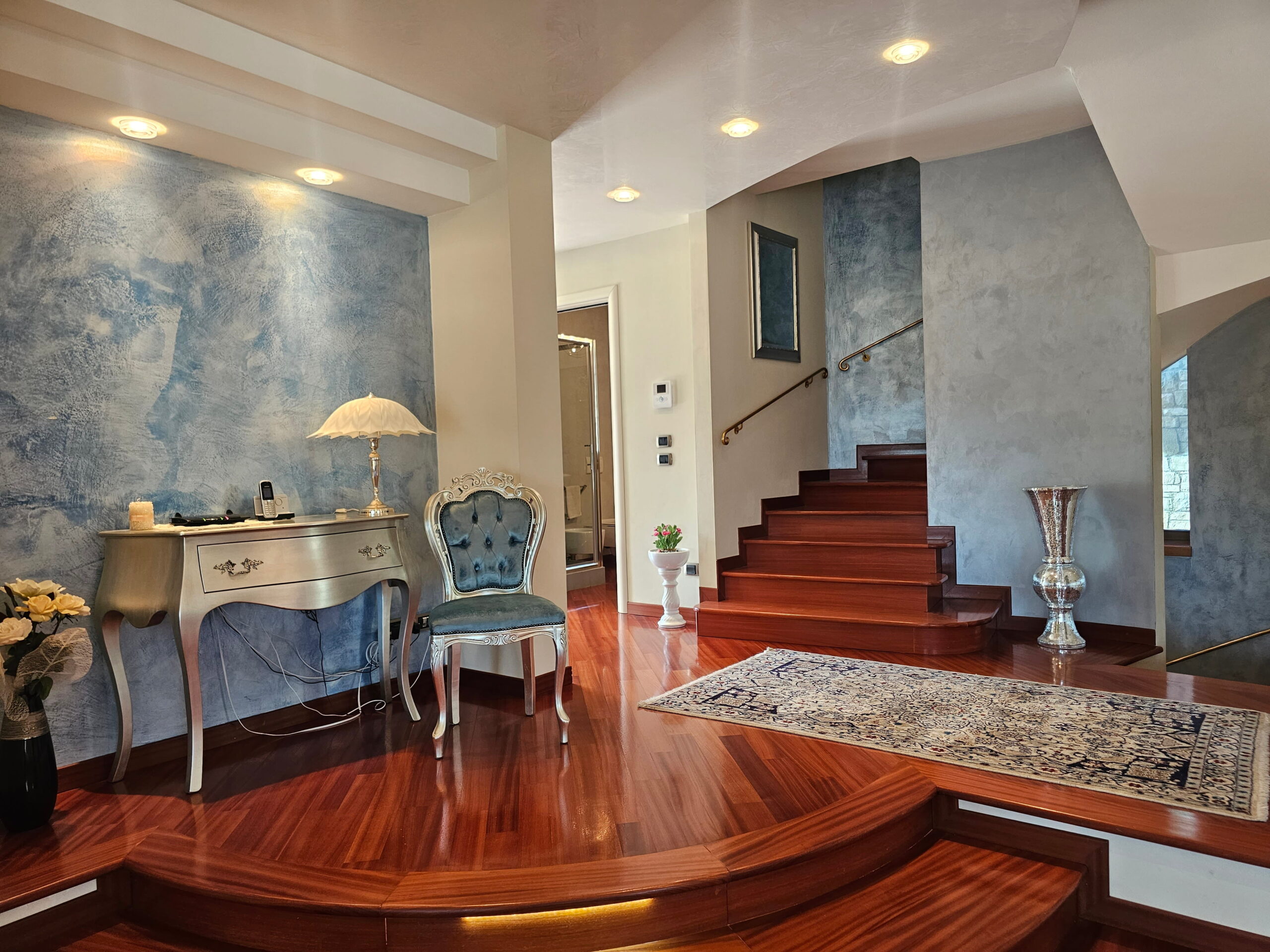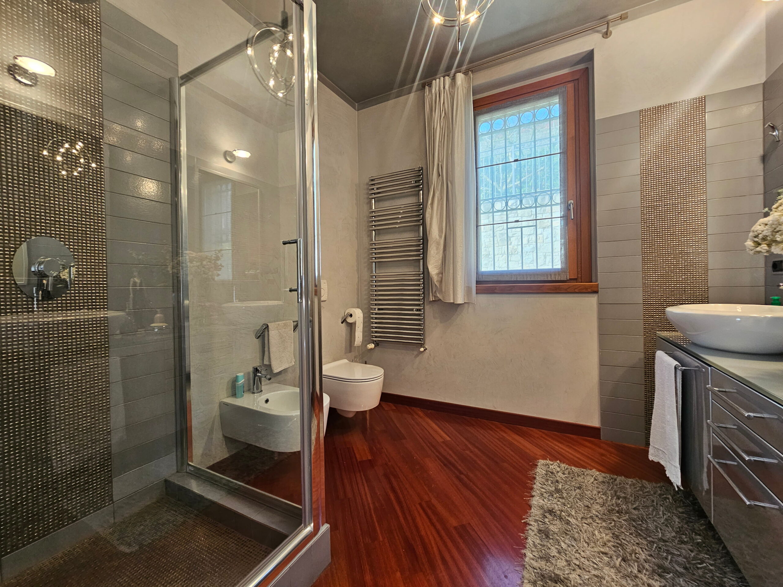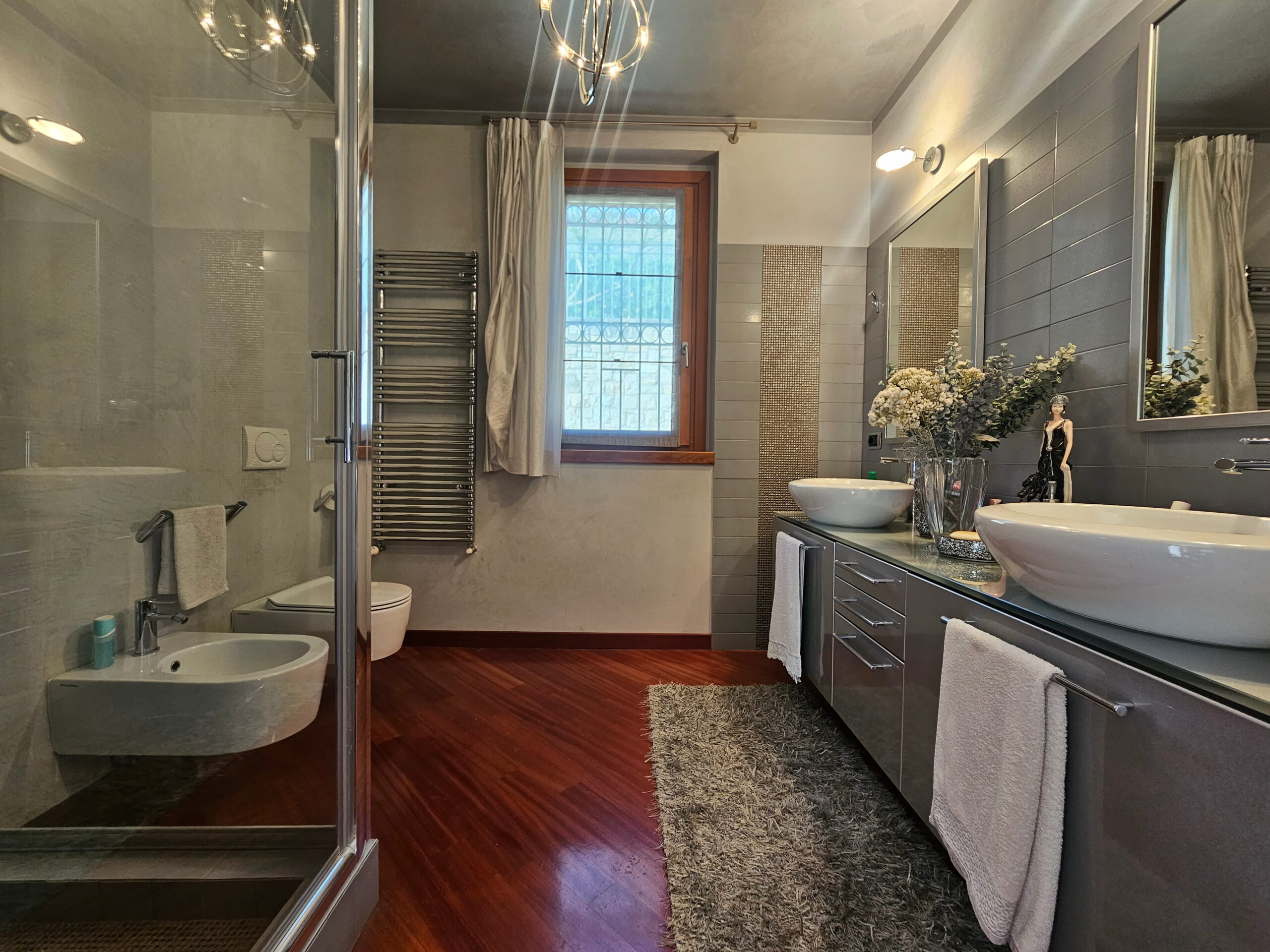 La villa è collegata internamente da una scala di design e ogni ambiente è stato progettato con materiali e soluzioni di assoluto pregio: -Riscaldamento a pavimento -Parquet di alta gamma in tutta la proprietà -Bagni in marmi pregiati e mosaici artistici -Climatizzazione in ogni ambiente -Impianto d’allarme volumetrico e perimetrale con videosorveglianza interna ed esterna -Predisposizione fotovoltaico -Pompa di calore con accumulo acqua calda -Termostati indipendenti per ogni ambiente -Serramenti in legno con doppio vetro, oscuranti elettrici regolabili -Travi a vista in legno lamellare nella zona notte -Controsoffitti nella zona giorno con illuminazione a faretti studiata su misura